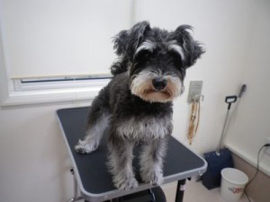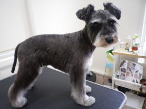 今回は、体も短めシュナウザー。顔もサイド少し長めのバリカンを入れてマユ・ヒゲも短め丸く。耳:体より少し長めのバリカンで表面を飼って。尾:体と同じバリカン。