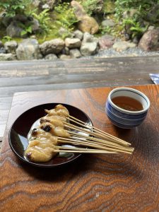 あぶり餅の白みそのタレが甘じょっぱくて一口食べた瞬間