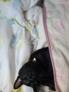 当初は警戒していましたが、今では一緒に寝てくれたり、遊んだりします🐾